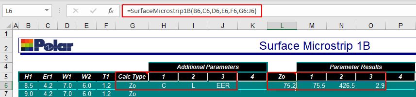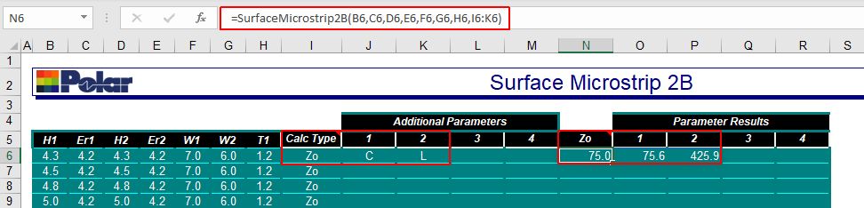 As this formula contains a range as opposed to a single value for the Calc Type it will be treated as an array formula and the results will be returned to multiple cells to the right of the formula cell (L6:O6 in the above example) designated Parameter Results 1, 2, 3, 4, corresponding to the Additional Parameters 1, 2, 3, 4. In later versions of Excel, if Excel is unable to return the results to the results cells (if, for example, they already contain data or are protected cells) Excel will return a result of “#Spill!”. In this case, delete any data in the cells to the right of the formula cell and rerun the calculation. Adding parameters The Surface Microstrip 2B example below includes results for Impedance, Z0, Capacitance, C and Inductance, L